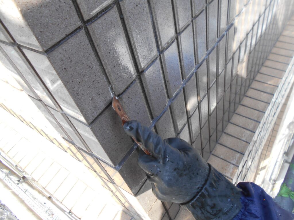 外壁タイルの目地のシーリングの打ち換えを行っています。
