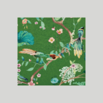 枝いっぱいに咲き誇る花々と、静かに佇む鳥たちを描いたデザイン。自然の生命力とやさしい華やぎを感じさせる情景を、絵画のように表現した作品です。