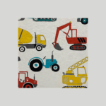 ショベルカーやトラックなど、はたらく車をモチーフにした、楽しくリズミカルなデザイン。シンプルな色使いと親しみやすいフォルムが、空間に明るさと遊び心を添える作品です。