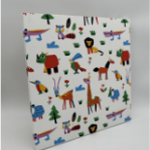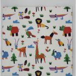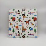 サファリの動物たちを、カラフルで愛らしいタッチで描いたデザイン。ライオンやキリン、鳥たちが楽しそうに並び、見ているだけで心が弾む一枚です。